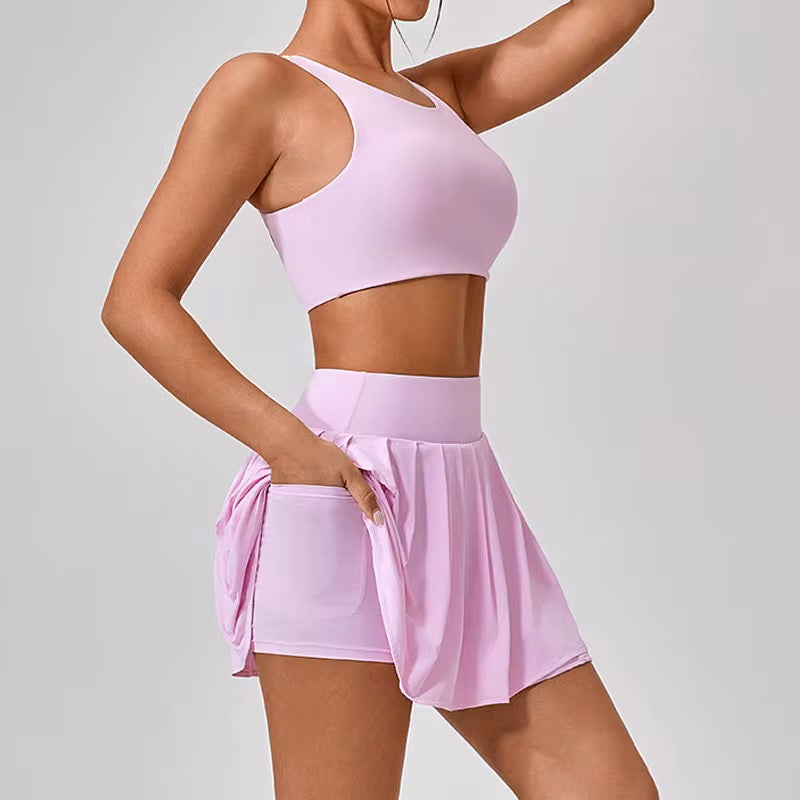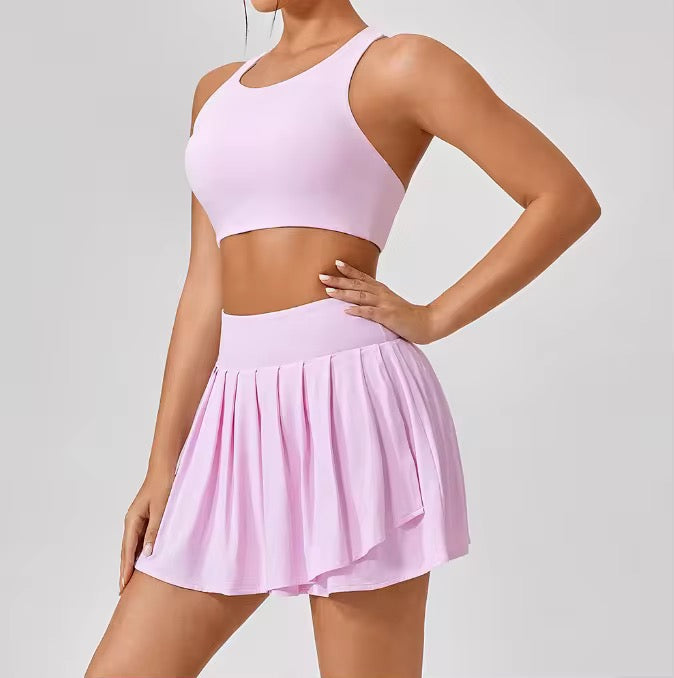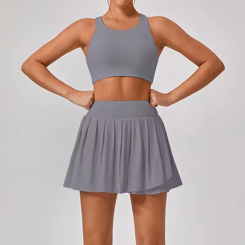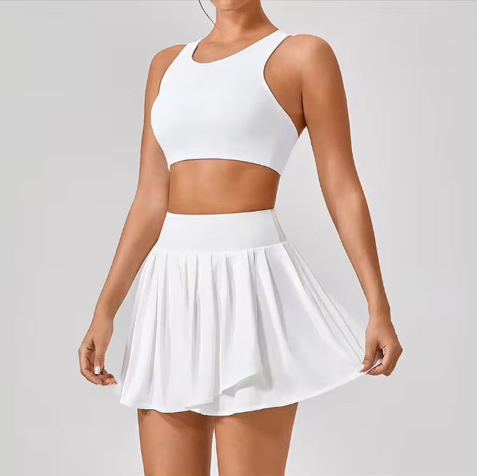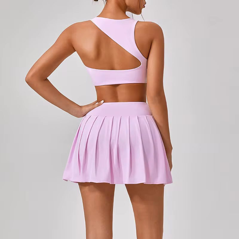 Description: Elevate your workout style with this chic and versatile sportswear set! Featuring a unique asymmetric back design and pleated skort for added flair, it combines comfort, functionality, and elegance for both fitness and casual wear.
