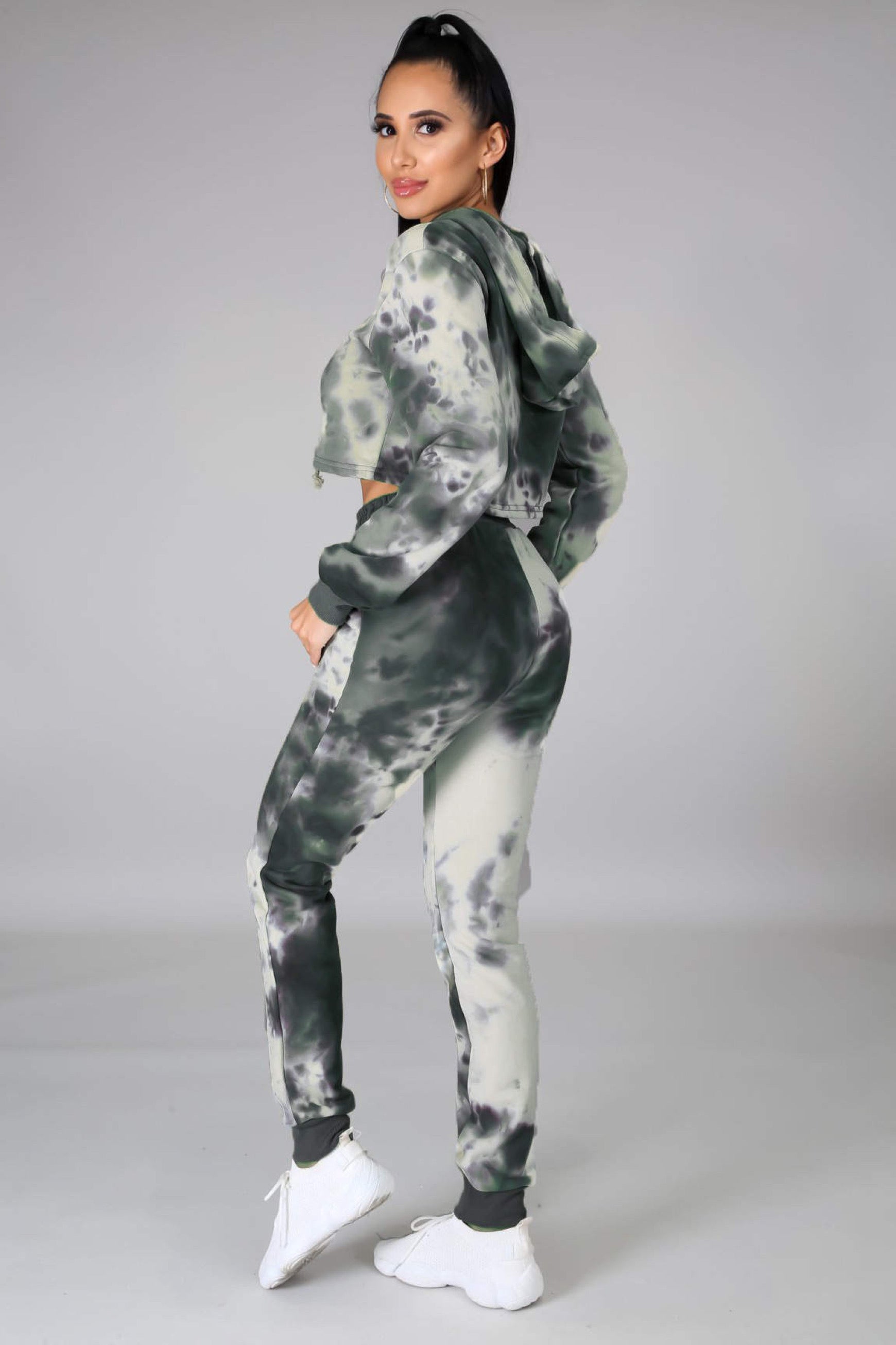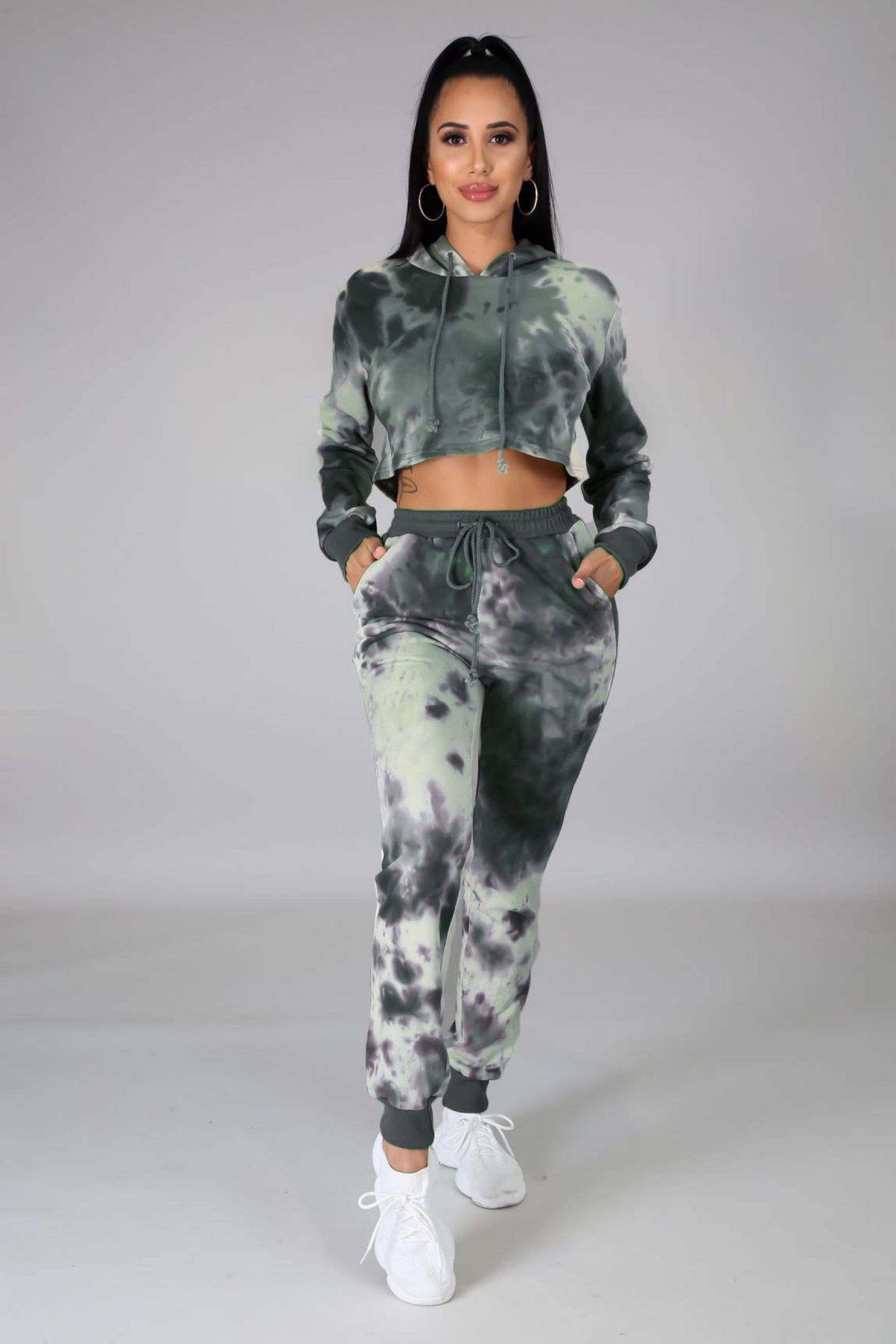 Design: Crop Top with hoodie and high waisted sweatpants.
